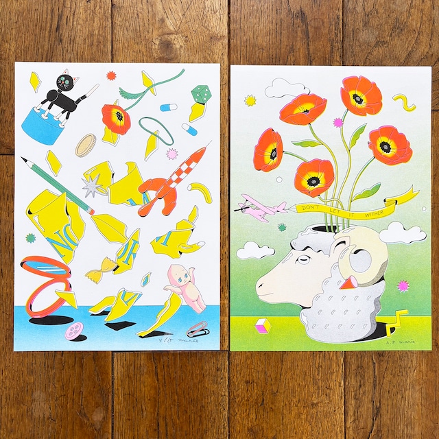 ワタナベマリエ リソグラフ(限定15点) 注文順に若い番号から発送します。 サイズ:A4(297×210mm) 2019年5月に台北にて第一回目のリソグラフ作品のグループ展示RISOLOGYを開催しました。 その第六回目の開催で、ギャラリー隣の部屋のリソグラフスタジオで刷った作品を展示販売いたします。 リソグラフとは、シルクスクリーン印刷やガリ版と同じ原理を基にしたデジタル孔版印刷で、スクリーン状の版に微細な孔(あな)を開け、そこからインクを用紙に押し出す印刷方法です。半水性のインクを使用するため、掠れたり色ムラが出たり、重ね塗りをしたようなアナログ感と味わいある仕上がりが魅力です。 普段イラストレーターは印刷する際の版について考えることはほどんどないと思いますが、色の濃度や掛け合わせを考えながらの版づくりは今後の創作のヒントやスパイスになると思います。 【参加者】 安里貴志/アンドウワカ/itsuritsu/カチナツミ/カネダココロ/鹿野里美/Mingweichuandeying/そねぽん/髙橋あゆみ/najuco/PALMEME/星野ちいこ/mitani/リック/ワタナベマリエ