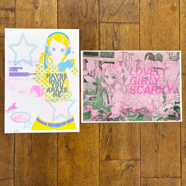 カチナツミ リソグラフ(限定15点) 注文順に若い番号から発送します。 サイズ:A4(297×210mm) 2019年5月に台北にて第一回目のリソグラフ作品のグループ展示RISOLOGYを開催しました。 その第六回目の開催で、ギャラリー隣の部屋のリソグラフスタジオで刷った作品を展示販売いたします。 リソグラフとは、シルクスクリーン印刷やガリ版と同じ原理を基にしたデジタル孔版印刷で、スクリーン状の版に微細な孔(あな)を開け、そこからインクを用紙に押し出す印刷方法です。半水性のインクを使用するため、掠れたり色ムラが出たり、重ね塗りをしたようなアナログ感と味わいある仕上がりが魅力です。 普段イラストレーターは印刷する際の版について考えることはほどんどないと思いますが、色の濃度や掛け合わせを考えながらの版づくりは今後の創作のヒントやスパイスになると思います。 【参加者】 安里貴志/アンドウワカ/itsuritsu/カチナツミ/カネダココロ/鹿野里美/Mingweichuandeying/そねぽん/髙橋あゆみ/najuco/PALMEME/星野ちいこ/mitani/リック/ワタナベマリエ