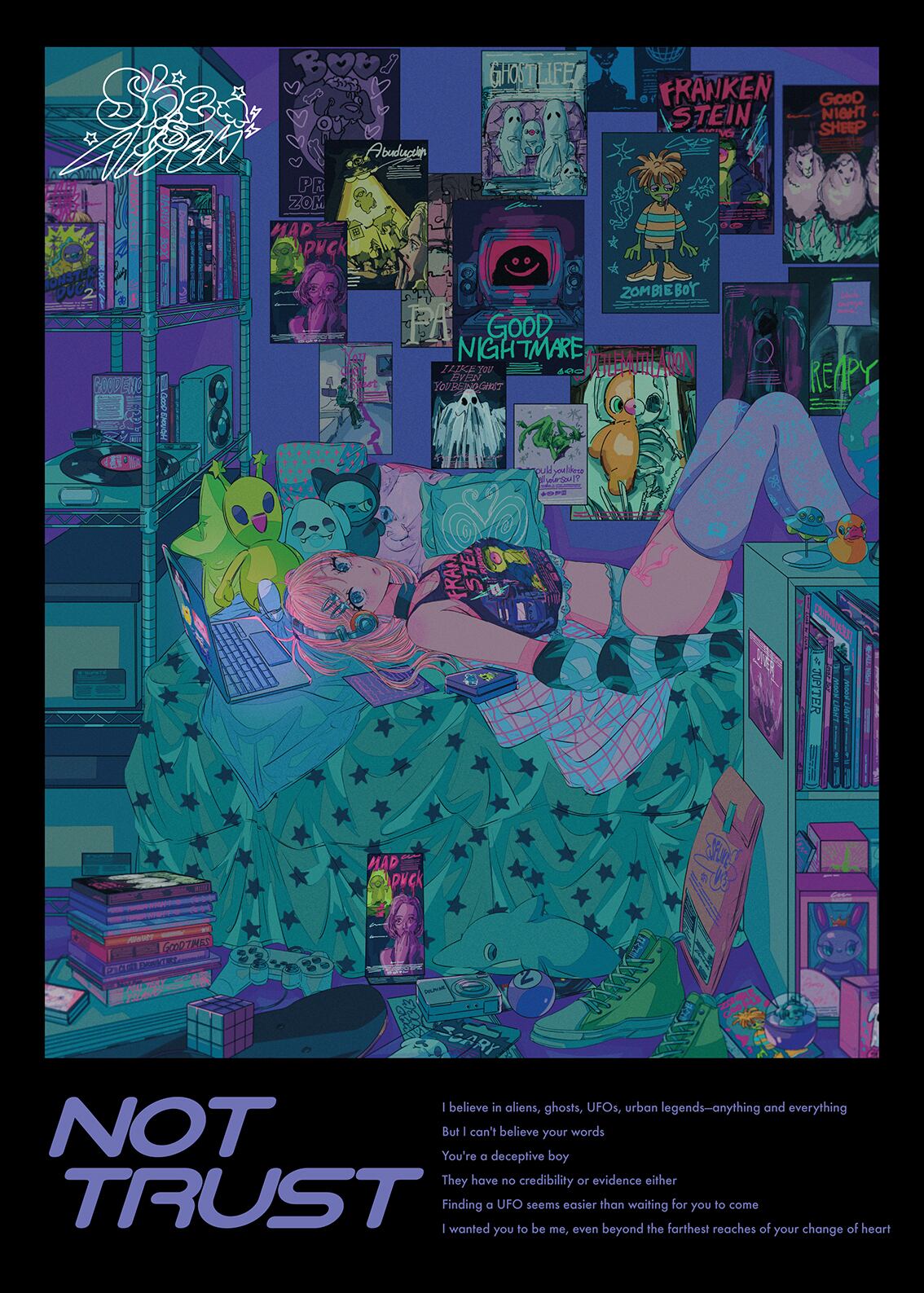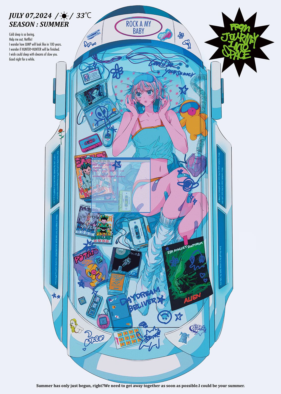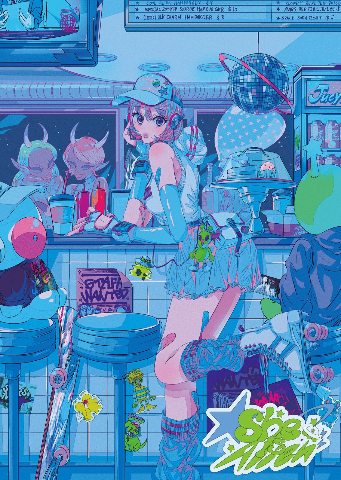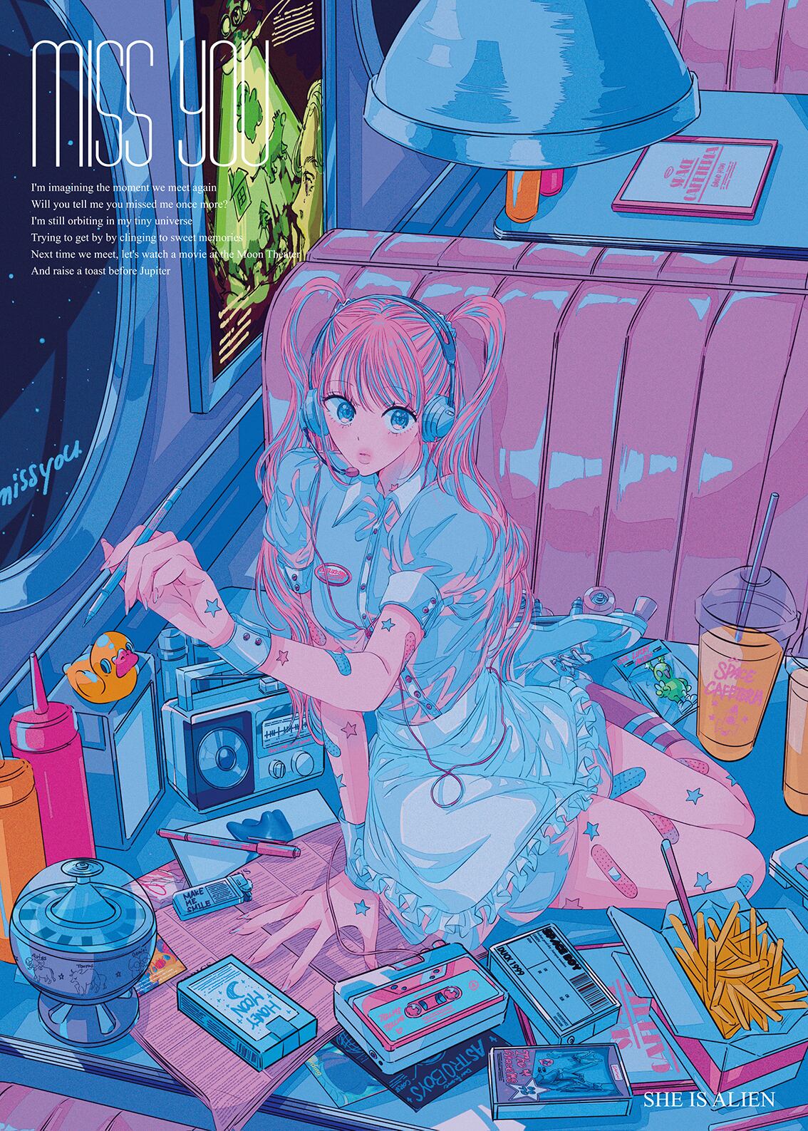 未知との遭遇をキッチュに描いた本展“SHE IS ALIEN”は、najucoさんの代名詞ともいえる独特なネオンライトな色使いと陰影、そしてディテールにこだわった背景描写が特徴です。音楽や映画への探究心と、ゲームやファッションへの関心から産まれるnajucoさんの世界観は、デジタルで描きはじめてコミックやアニメへの偏愛を隠さない方が多数の中でオリジナリティを放っていて、いまの時代の空気感を自らのフィルターを通して捉えていると感じています。