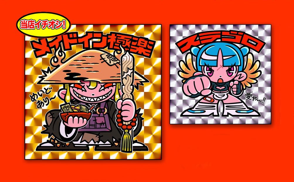 ギブミ〜!トモタカさんの作品集発売記念展示「萬事満福」(2026年1月13日〜25日)で販売中のビックリマン風ステッカーです。