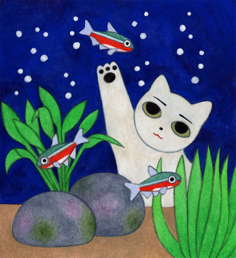 増田ソフィ ミニ額作品「テトラを捕まえようとする猫」(額装込)