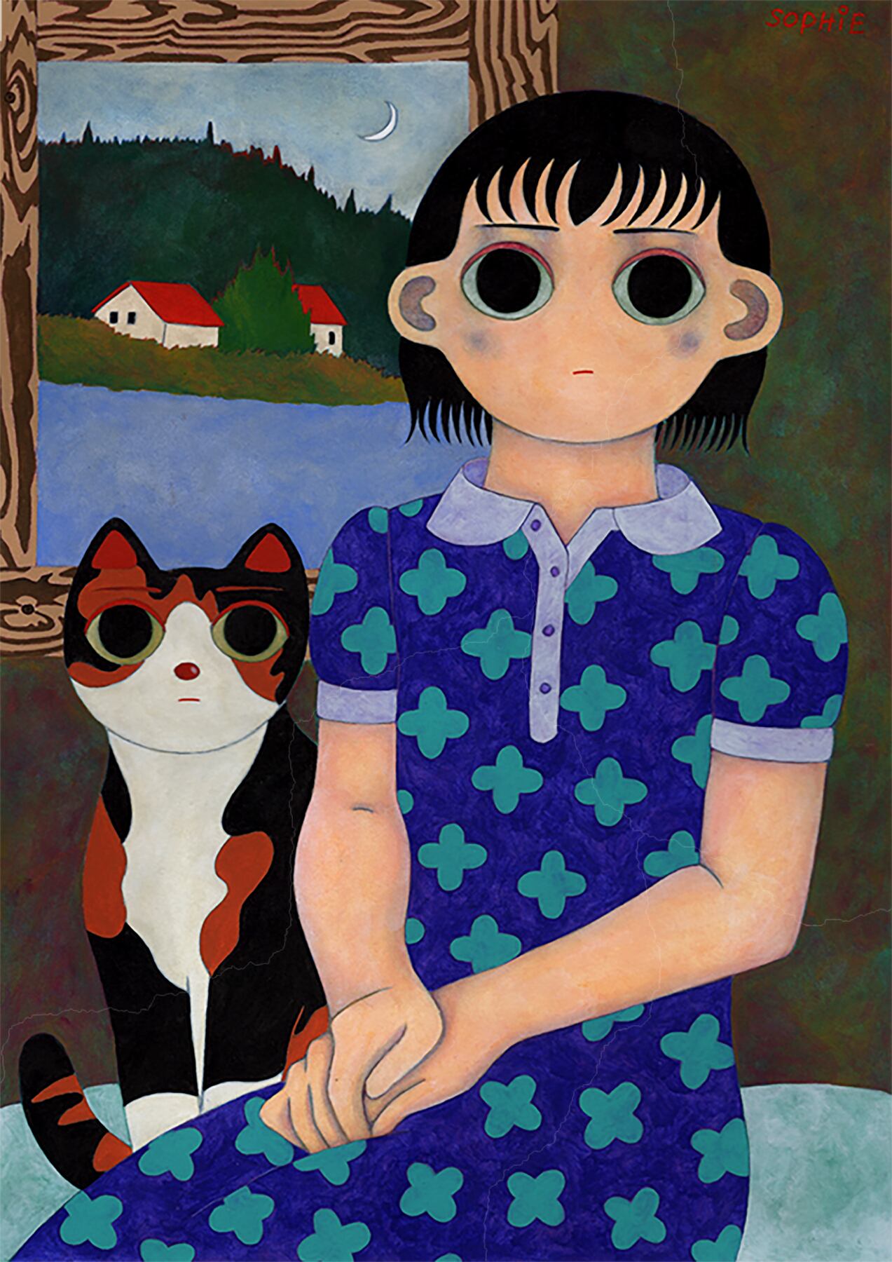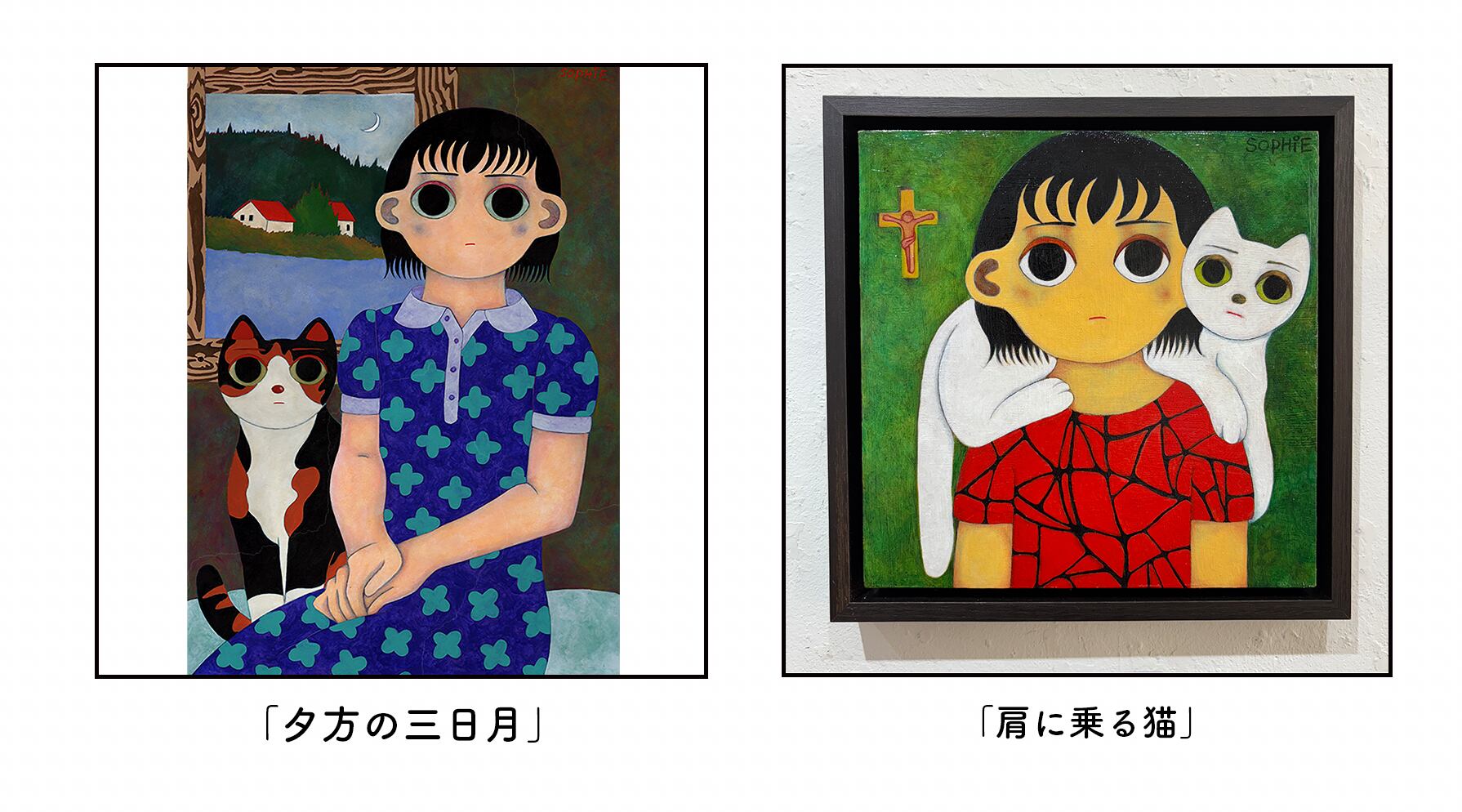 増田ソフィ 額装原画「夕方の三日月」「肩に乗る猫」(額装込/送料込)
