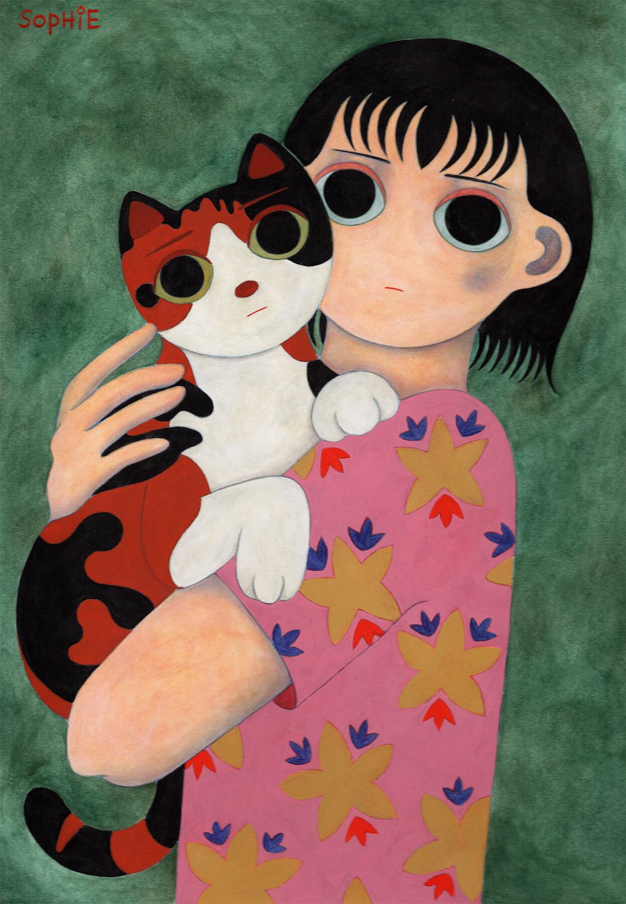増田ソフィ 額装原画「三毛猫を抱く女の子」(額装込/送料込)