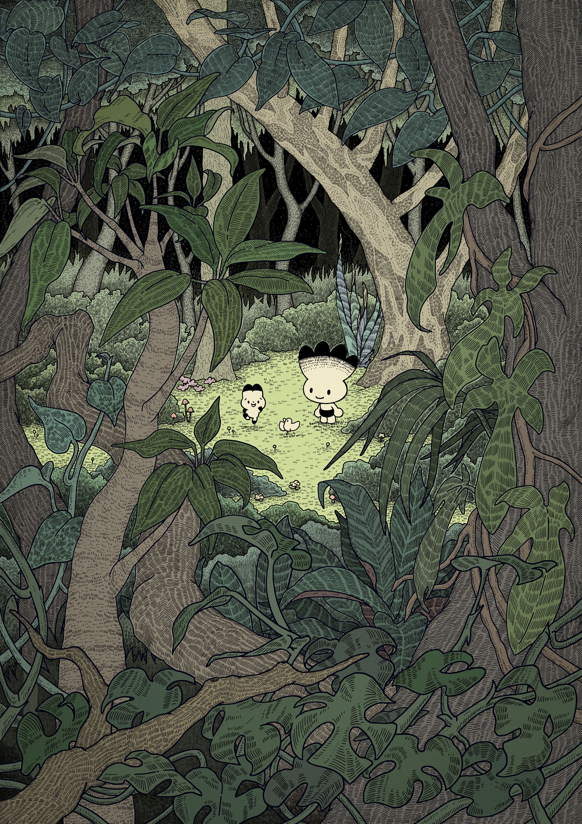 以前より、タキタさんが描く深い森の樹々や植物の野生味あふれる描写と、愛らしいキャラクターたちの楽しくほのぼのとした佇まいが織りなすコントラストにとても興味を惹かれておりました。